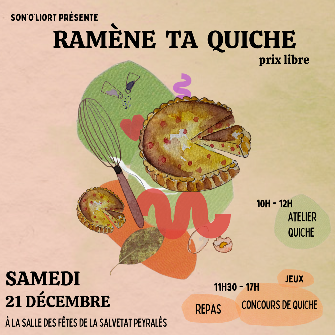 Le concept : chaun.e apporte une quiche de sa confection, et un grand concours sera organisé pour décerner différent.e.s prix ! 🥧🏆 N’hésitez pas à participer en équipes !