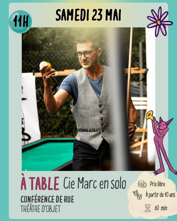 Marc Sollogoub nous invite à nous asseoir autour de sa table pour trouver une façon d’agir concrètement sur notre monde commun. La table se transforme en billard, en plan de métro, en moyenne montagne, en banquet pour étayer ses propos, faire des liens entre des choses qui n’en ont (presque) pas, et prouver qu’il y a (tout de même) un truc à faire pour changer la donne… Entre conférence décalée, harangue de rue, théâtre d’objet et chorale participative, un solo qui donne envie de passer à l’action collective.