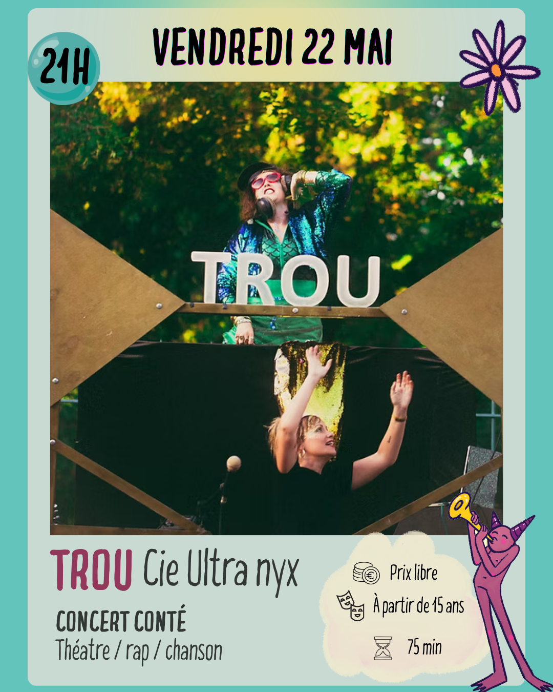 TROU s’articule autour des compositions de Mathilde Paillette. De la chanson mignonne et innocente au rap incisif et percutant, la textualité des morceaux occupe la première place. La musicalité est avant tout ici un support à la traversée organique et vocale des deux comédiennes, militantes émotionnelles, armées de micros, d’une guitare, d’un pad, d’écailles et de paillettes…