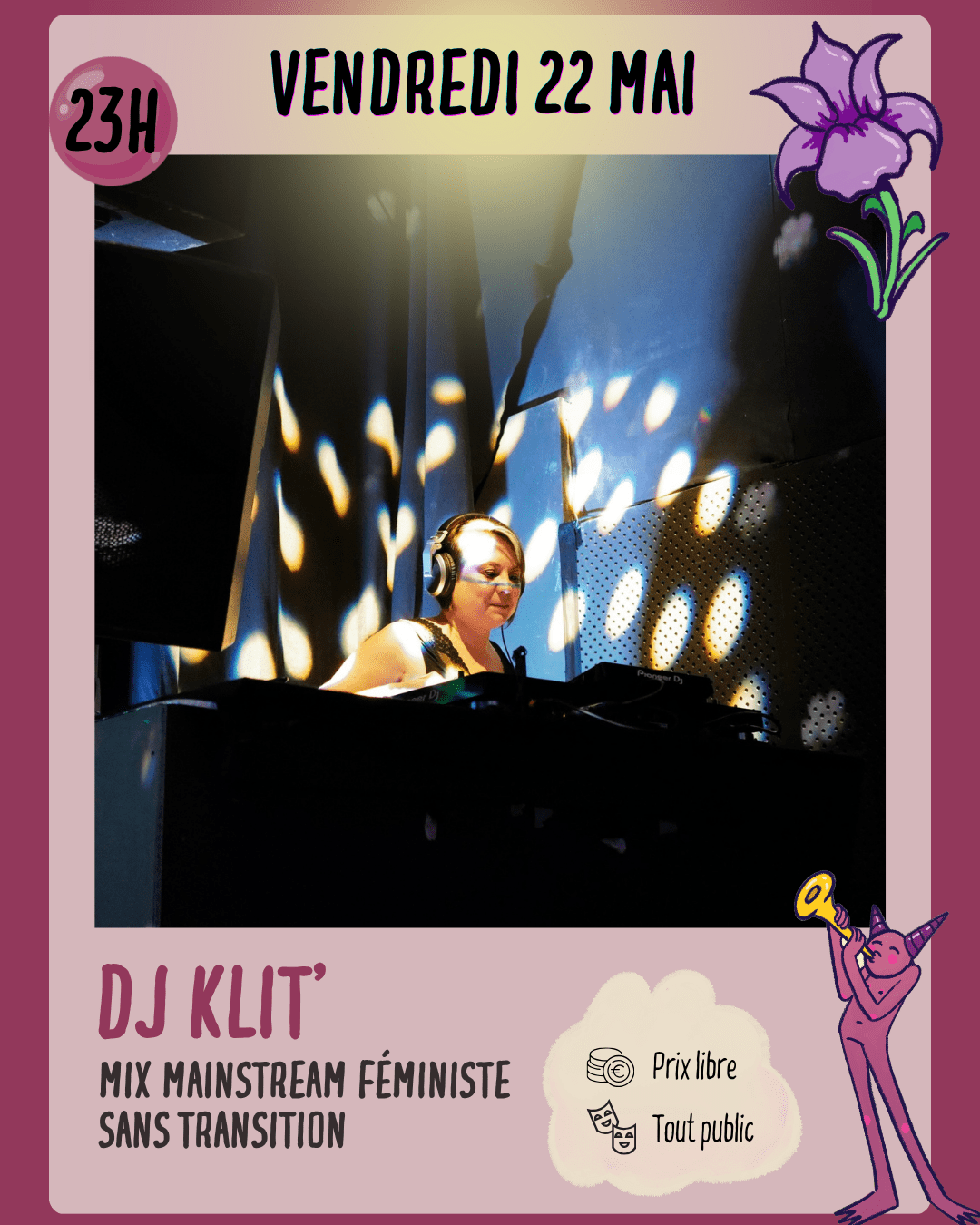 Ses sets mêlent pop, rap et électro pour devenir des cris de puissance et de plaisir. Elle mixe pour que chacun·e trouve sa place en pleine lumière et fasse son propre show. Le dancefloor devient un espace joyeux et décomplexé. DJ KLIT’, une révolte pailletée, la boom brute, le son de celleux qui ne s’excusent plus.